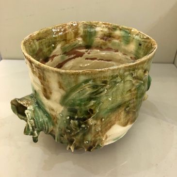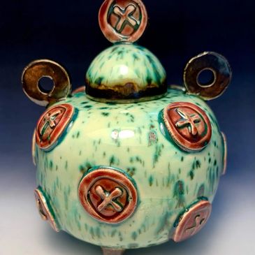 I enjoyed learning how to make simple relief sprigs and models. I developed my own glazes and decorating techniques. I throw all my pots, add sprigs to the forms and decorate them with beautiful glazes.