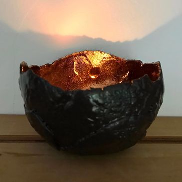 Working from a garden studio surrounded by the peace and tranquillity of nature, Sally's thrown domestic ware is heavily influenced by the changing seasons with glaze colours developing in unison with the rhythm of nature. She particularly enjoys working with porcelain to hand-build enormous bowls which are often imprinted with finds from the beach or the hedgerows and lined with metallic lustres and melted glass. Each of these bowls is incredibly special and shaped to contain the energy which surrounds us, lit with a candle they really are magical. The only way to experience these pieces is to hold them and feel the energy within.