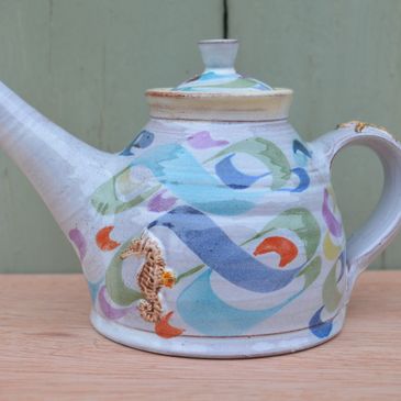 Each pot is thrown and turned on the potters’ wheel. Relief sprigs and models are added to each pot transforming these traditional shapes into individual works of artistic fun. The pots are decorated individually with brushwork using metallic oxides and vibrant glazes.