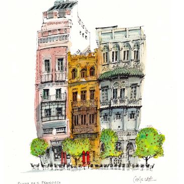 I do seem to have the best job in the world. Go to nice places, sit down for an hour, and enjoy the warmth. It’s a good life. Even if I do have to balance on a precarious three-legged stool. Lucky for you I can’t intellectualise about my work, I don’t have complex reasons for doing it, and I often don’t know why I draw a certain subject. And do you know what? That doesn’t bother me. I just like the colours, the overlay of man-made structures, the accidents of architecture over time.